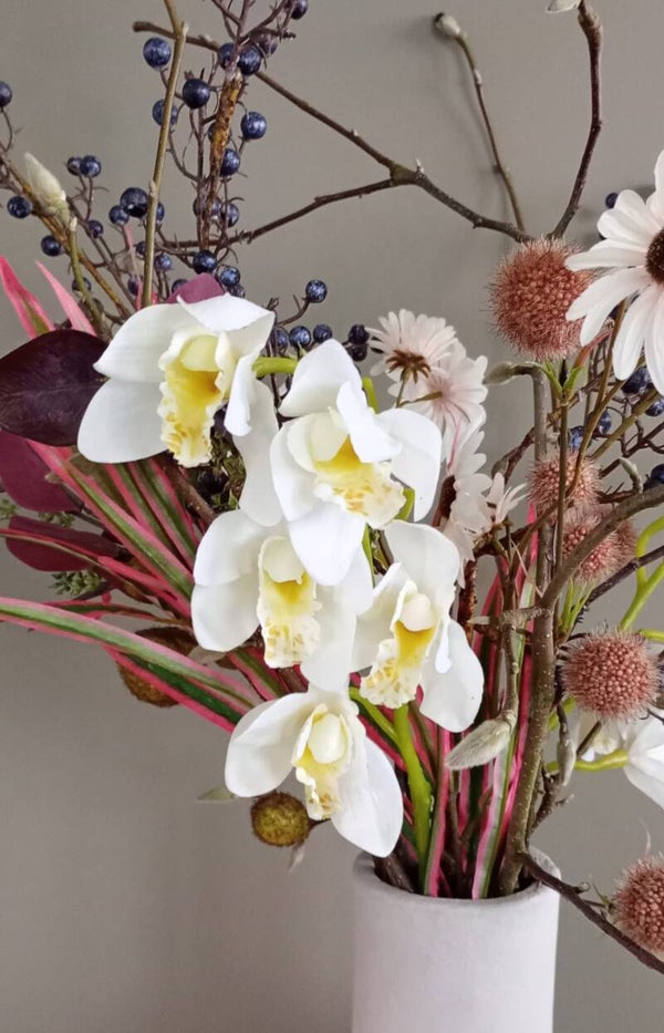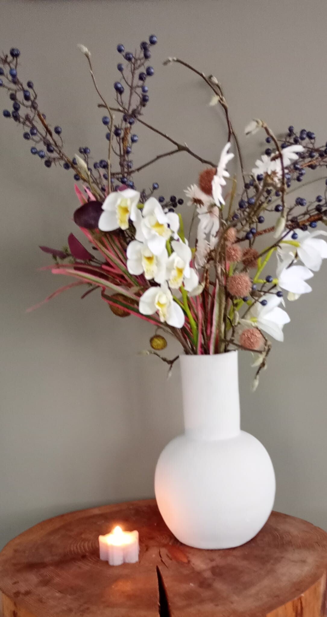 Deze creatie kunt u als geheel kopen. Het is inclusief de vaas en de zijdebloemen. Stijlvol en eenvoud. Totale hoogte 65 cm.