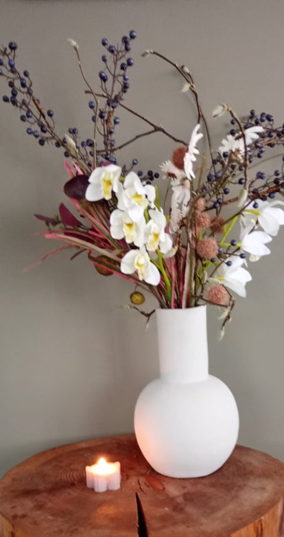 In deze vaas kan een prachtig zijdeboeket gestyled worden. Te denken aan een klassiek of modern boeket. Net wat uw wensen zijn.